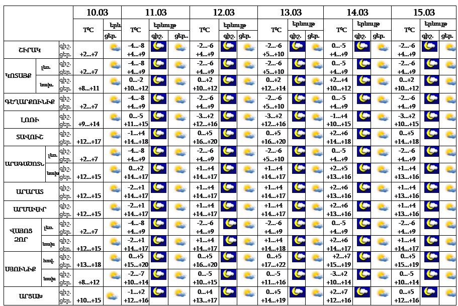 ՀՀ ԱԻՆ օդերեւութաբանական ծառայության փոխանցմամբ, Հայաստանի տարածքում մարտի 10-ի ցերեկը, 11-14-ն սպասվում է առանց տեղումների եղանակ: Քամին կլինի հարավ-արևմտյան՝ 3-8 մ/վրկ արագությամբ: Օդի ջերմաստիճանը մարտի 10-13-ը աստիճանաբար կբարձրանա 2-4 աստիճանով: Երևան քաղաքում մարտի 10-ի ցերեկը, 11-14-ն սպասվում է առանց տեղումների եղանակ: