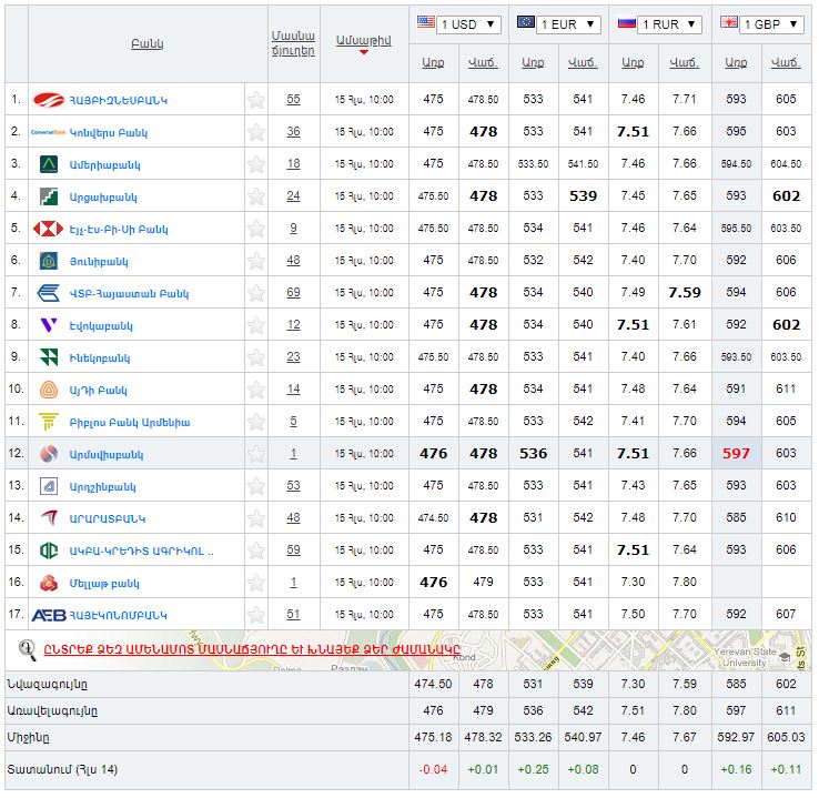 Ներկայացնում ենք Հայաստանի բանկերի կողմից գնվող և վաճառվող արտարժույթների փոխարժեքները հուլիսի 15-ի դրությամբ: Ամերիկյան մեկ դոլարը գնվում է 474.50 դրամ նվազագույն և 476 դրամ առավելագույն փոխարժեքով, վաճառվում՝ 478  դրամ նվազագույն և 479 դրամ առավելագույն փոխարժեքով: Մեկ եվրոն գնվում է 531 դրամ նվազագույն և 536 դրամ առավելագույն փոխարժեքով, իսկ վաճառվում՝ 539  դրամ նվազագույն և 542 դրամ առավելագույն փոխարժեքով: Ռուսական ռուբլին գնվում է 7.30 դրամ նվազագույն և 7.51 դրամ առավելագույն փոխարժեքով, վաճառվում` 7.59 դրամ նվազագույն և 7.80 դրամ առավելագույն փոխարժեքով: