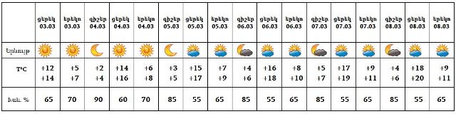 Հանրապետության տարածքում՝ Մարտի 3-ի ցերեկը, 4-8-ը սպասվում է առանց տեղումների եղանակ։ Քամին՝ հարավ-արևմտյան՝ 3-8 մ/վ: Օդի ջերմաստիճանը մարտի 3-ի ցերեկը, 4-8-ն աստիճանաբար կբարձրանա 5-7 աստիճանով: Երևան քաղաքում՝ Մարտի 3-ի ցերեկը, 4-8-ը սպասվում է առանց տեղումների եղանակ։ Երևան քաղաքի մարտի 4-ի բազմամյա կլիմայական տվյալներ. • Օդի առավելագույն ջերմաստիճան` 21.00C (2004 թ.) • Օդի նվազագույն ջերմաստիճան` -22.30C (1985 թ.) • Օդի միջին օրական ջերմաստիճան` 3.20C
