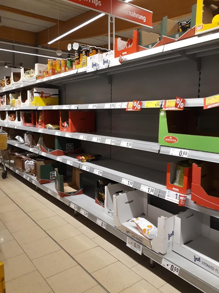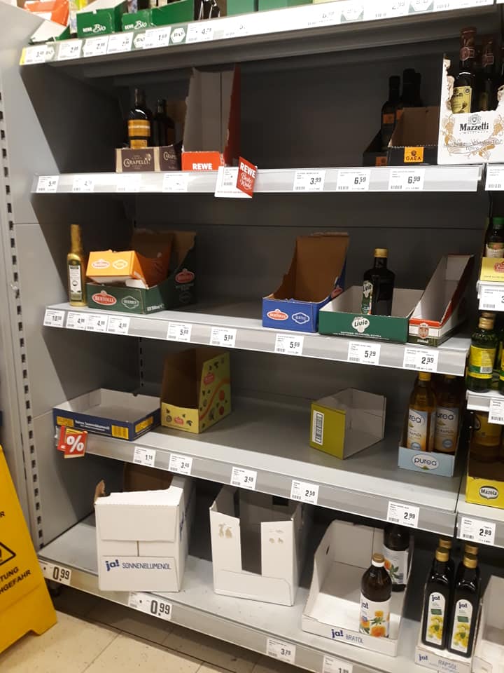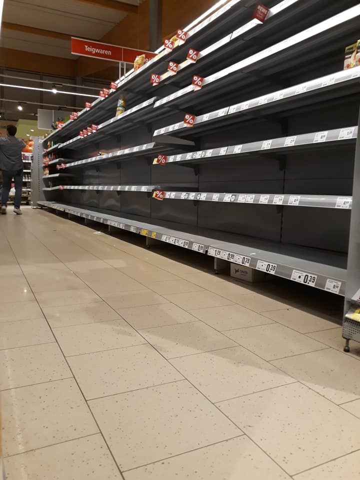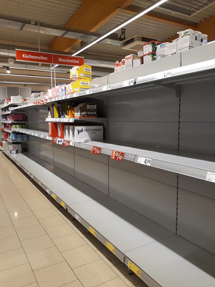 Կորոնավիրուսով պայմանավորված՝ ամբողջ աշխարհում ամեն օր մեծ քանակով բժշկական դիմակներ, ախտահանիչ նյութեր ու առաջին անհրաժեշտության այլ պարագաներ են սպառվում: Մարդիկ դատարկում են խանութներն ու գնում երկար պահվող ուտելիքներ ու անհրաժեշտ ամեն բան: Ամենաշատ վաճառված ապրանքներից է զուգարանի թուղթը, որի դեֆիցիտ է նկատվում եվրոպական, ամերիկյան և ավստրալական խանութներում: Համացանցի հայ օգտատերերից մեկը հրապարակել է լուսանկարներ Բեռլինի խանութներից մեկից, որտեղ դարակները կամ ամբողջովին դատարկ են, կամ գրեթե դատարկ են: