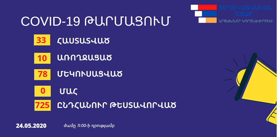 Մայիսի 24-ի ժամը 11-ի դրությամբ Արցախում կորոնավիրուսի հաստատված դեպքերի թիվը 33 է, առողջացել է 10 մարդ։