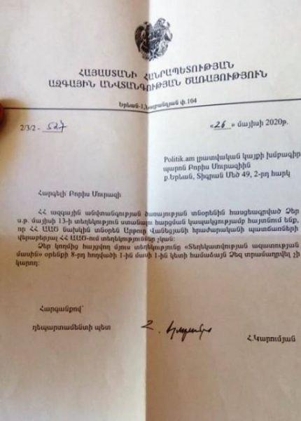 Հայաստանում գործակալներին բացահայտում է Ազգային Անվտանգության ծառայությունը, ուստի մենք գրավոր հարցում էինք ուղարկել ԱԱԾ՝ պարզելու համար, թե ի՞նչ տեղեկություններ ունեն Արթուր Վանեցյանի հրաժարականի մասին և որքանո՞վ են իրական Հրաչյա Հակոբյանի ակնարկները։