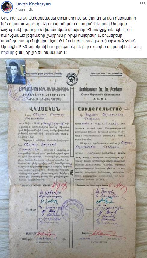 ՀՀ 2-րդ նախագահ Ռոբերտ Քոչարյանի կրտսեր որդին՝ Լևոն Քոչարյանն իր ֆեյսբուքյան էջում գրել է․ «Երբ լինում եմ Ստեփանակերտում սիրում եմ փորփրել մեր ընտանիքի հին փաստաթղթերը: Այս անգամ գտա պապիս` Սեդրակ Սարգսի Քոչարյանի դպրոցի ավարտական վկայանը: Հետաքրքիրն այն է, որ ուսուցանած լեզուների շարքում ի թիվս հայերենի և ռուսերենի, ստանդարտ բլանկի վրա նշված է նաև թուրքաց լեզու(тюркский язык): Այսինքն 1930 թվականին ադրբեջաներեն լեզու որպես այդպիսին չի եղել»: