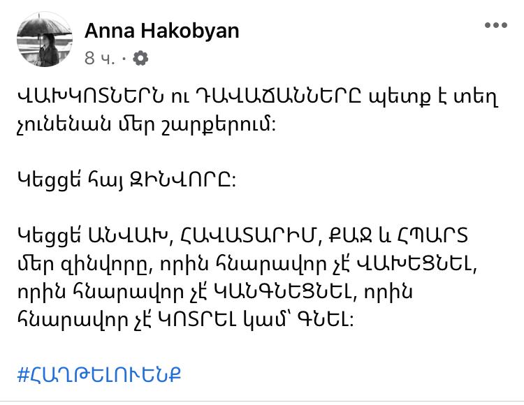 Աննա Հակոբյանը ֆեյսբուքյան իր էջում գրել է․