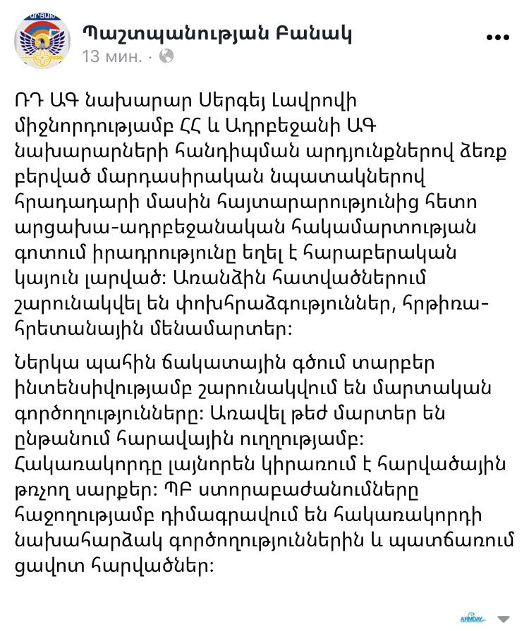 ՌԴ ԱԳ նախարար Սերգեյ Լավրովի միջնորդությամբ ՀՀ և Ադրբեջանի ԱԳ նախարարների հանդիպման արդյունքներով ձեռք բերված մարդասիրական նպատակներով հրադադարի մասին հայտարարությունից հետո արցախա-ադրբեջանական հակամարտության գոտում իրադրությունը եղել է հարաբերական կայուն լարված: Առանձին հատվածներում շարունակվել են փոխհրաձգություններ, հրթիռա-հրետանային մենամարտեր, հայտնում են Արցախի պաշտպանության նախարարությունից: Ներկա պահին ճակատային գծում տարբեր ինտենսիվությամբ շարունակվում են մարտական գործողությունները: Առավել թեժ մարտեր են ընթանում հարավային ուղղությամբ: Հակառակորդը լայնորեն կիրառում է հարվածային թռչող սարքեր: ՊԲ ստորաբաժանումները հաջողությամբ դիմագրավում են հակառակորդի նախահարձակ գործողություններին և պատճառում ցավոտ հարվածներ:
