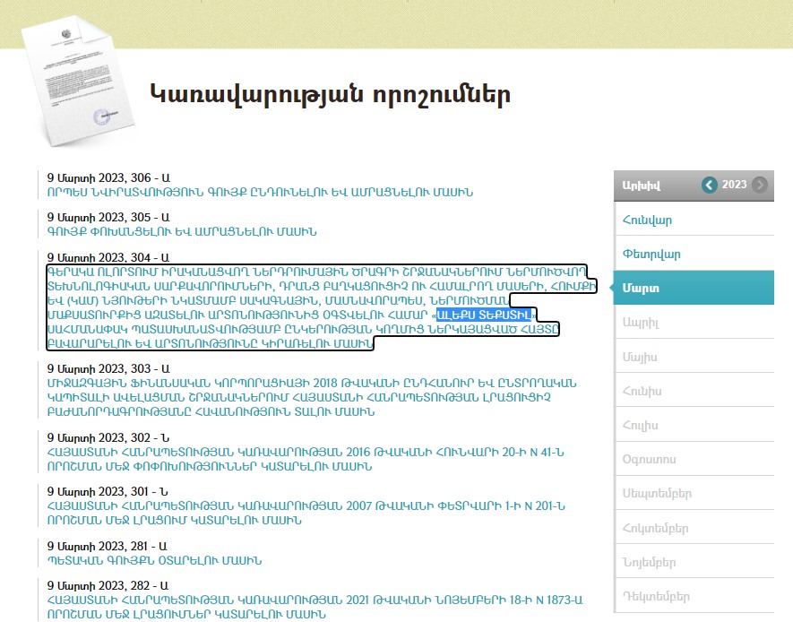 Դրա հաջորդ օրը, 2023 թվականի մարտի 9-ին, ՀՀ վարչապետ Նիկոլ Փաշինյանի նախագահությամբ տեղի ունեցած ՀՀ կառավարության նիստում, ընդունվել է թիվ 304-Ա որոշումը, որով 3 280 053 415 ՀՀ դրամի (մոտ 8,5 մլն ԱՄՆ դոլարի) արտոնություն է տրվել «ԱԼԵՔՍ ՏԵՔՍՏԻԼ» ընկերությանը ոչ թե սարքավորումներ, այլ արտադրության համար հումք և նյութեր ներմուծելու համար (այդ թվում՝ Թուրքիայից)։