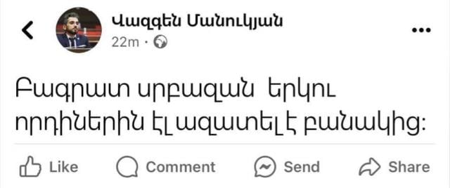 Խոսքը Վազգեն Մանուկյան անուն–ազգանունով ինչ–որ ՔՊ–ական երիտասարդի մասին է, ով նման գրառում էր արել։ Մի ամբողջ օր պահանջվեց սույն տղային վերջապես հասկանալ, որ մեղմ ասած կեղծ տեղեկատվություն է հրապարակել, բայց քանի, որ որոշ ՔՊ–ականներ եթե խայտառակվում են, ապա մինչև վերջ, հետևաբար նույն Վազգենը նորից գրառում է արել, չմոռանալով հերքել իր երեկվա գրածն ու հեռացնել գրառումը, բայց այս անգամ էլ Բագրատ Սրբազանին վերագրել է մի բիզնես, որի հետ Տավուշի թեմի առաջնորդը որեւէ առնչություն չունի, ինչը սևով սպիտակի վրա հերքվել է։