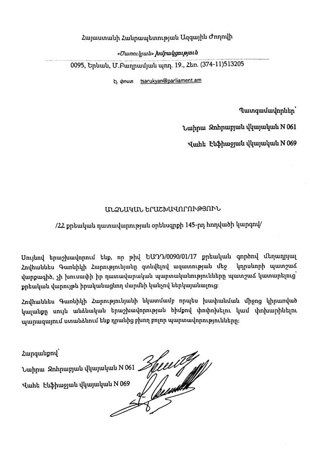 «Ծառուկյան» խմբակցության պատգամավորները ներկայացրել են «Սասնա ծռեր» խմբի անդամ Հովհաննես Հարությունյանի խափանման միջոցը փոխելու երաշխավորություն