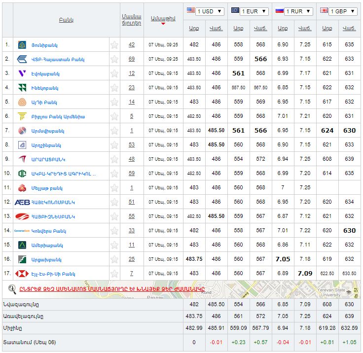 Ներկայացնում ենք Հայաստանի բանկերի կողմից գնվող և վաճառվող արտարժույթների փոխարժեքները սեպտեմբերի 7 -ի դրությամբ՝ ըստ rate.am-ի: Ամերիկյան մեկ դոլարը գնվում է 482 դրամ նվազագույն և 484 դրամ առավելագույն փոխարժեքով, վաճառվում՝ 485.50 դրամ նվազագույն և 486 դրամ առավելագույն փոխարժեքով: Մեկ եվրոն գնվում է 554  դրամ նվազագույն և 562 դրամ առավելագույն փոխարժեքով, իսկ վաճառվում՝ 566  դրամ նվազագույն և 572 դրամ առավելագույն փոխարժեքով: Ռուսական ռուբլին գնվում է 6.85  դրամ նվազագույն և 7.07  դրամ առավելագույն փոխարժեքով, վաճառվում` 7.15 դրամ նվազագույն և 7.30 դրամ առավելագույն փոխարժեքով: