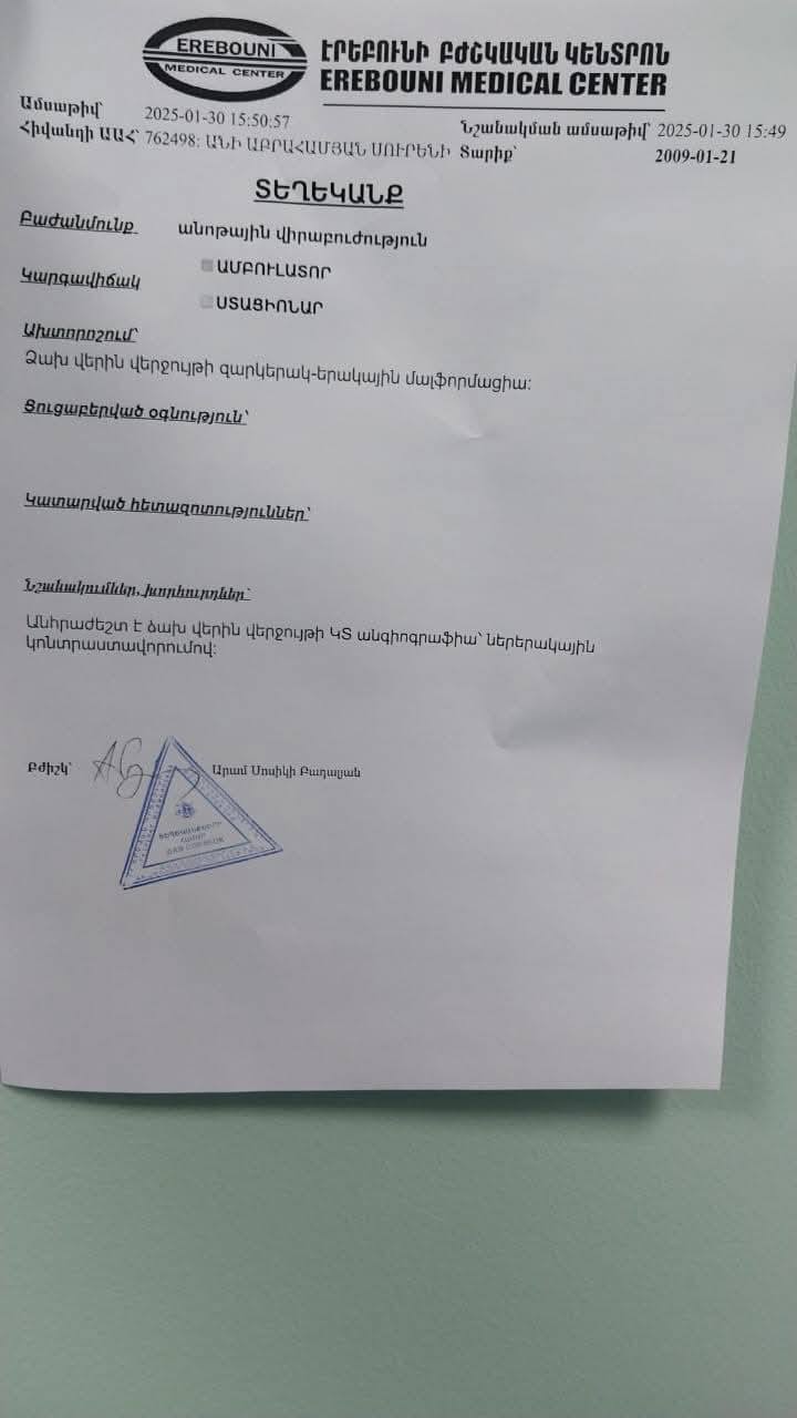 Նաիրի Բժշկական Կենտրոնում ախտորոշվել է Ձախ վերին վերջույթի 3-րդ մատի պրոքսիմալ ֆալանգի արտերիո-վենոզ ֆիստուլա։ Խորանիստ և մակերեսային երակները անցանելի են 2 կողմից։