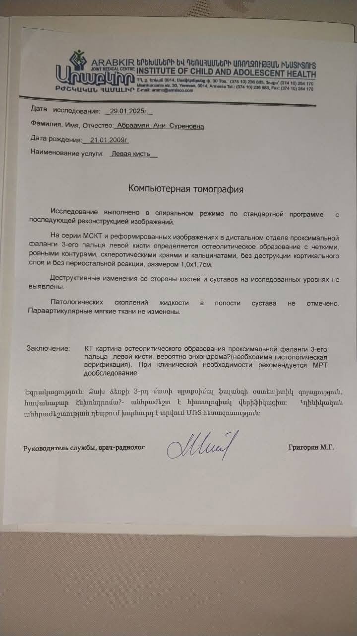 Արաբկիրի Երեխաների և Դեռահասների Առողջության Ինստիտուտում ախտորոշվել է Ձախ ձեռքի 3-րդ մատի պրոքսիմալ (հիմնային) ֆալանգի դիստալ հատվածի կիստոզ ոսկրային գոյածություն, ԷՆԽՈՆԴՐՈՄԱ։
