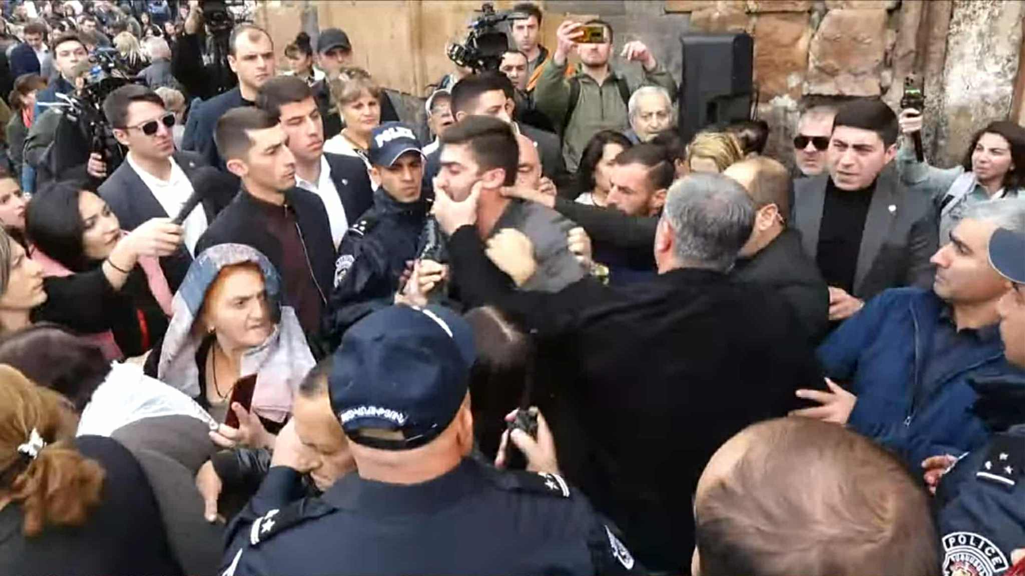 «Կարգալույծ քահանան իրավունք չունի պատարագ անել»։ Բղավեց քաղաքացիներից մեկը՝ Հայկ Դորունցը Հովհաննավանքի բազմամարդ բակում, ինչից հետո անվտանգության աշխատակիցները ձեռքերով փակեցին նրա բերանն ու տարան անհայտ ուղղությամբ։