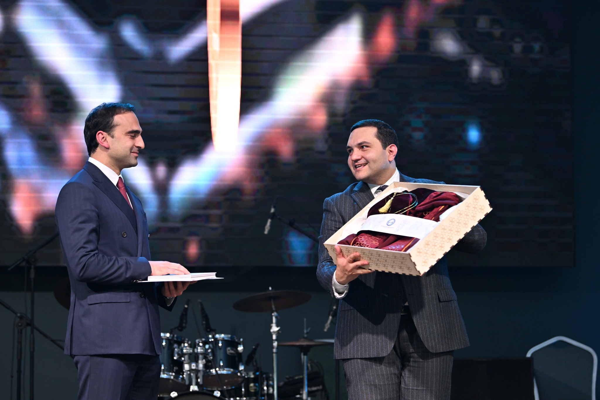 Ոսկե մեդալը Երևանի քաղաքապետ Տիգրան Ավինյանին է հանձնել ՀԱՊՀ ռեկտոր Գոռ Վարդանյանը:
