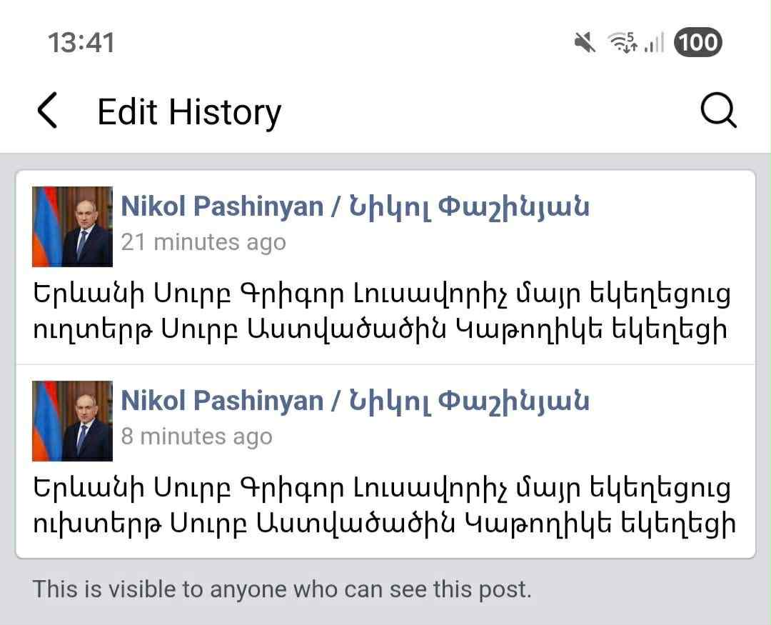 Ուշագրավն այն է, որ եկեղեցու «բարենորոգման» գործին «լծված» Փաշինյանը, ով երկու օր առաջ «տիրադավ» անունը ստացած բարձրաստիճան հոգևորականների հետ Վեհափառին հեռացնելու «ճանապարհային քարտեզ էր մշակում և ստորագրում, դեռ չի հասցրել անգամ իր ֆեյսբուքյան էջը վարողներին «կրթել»: