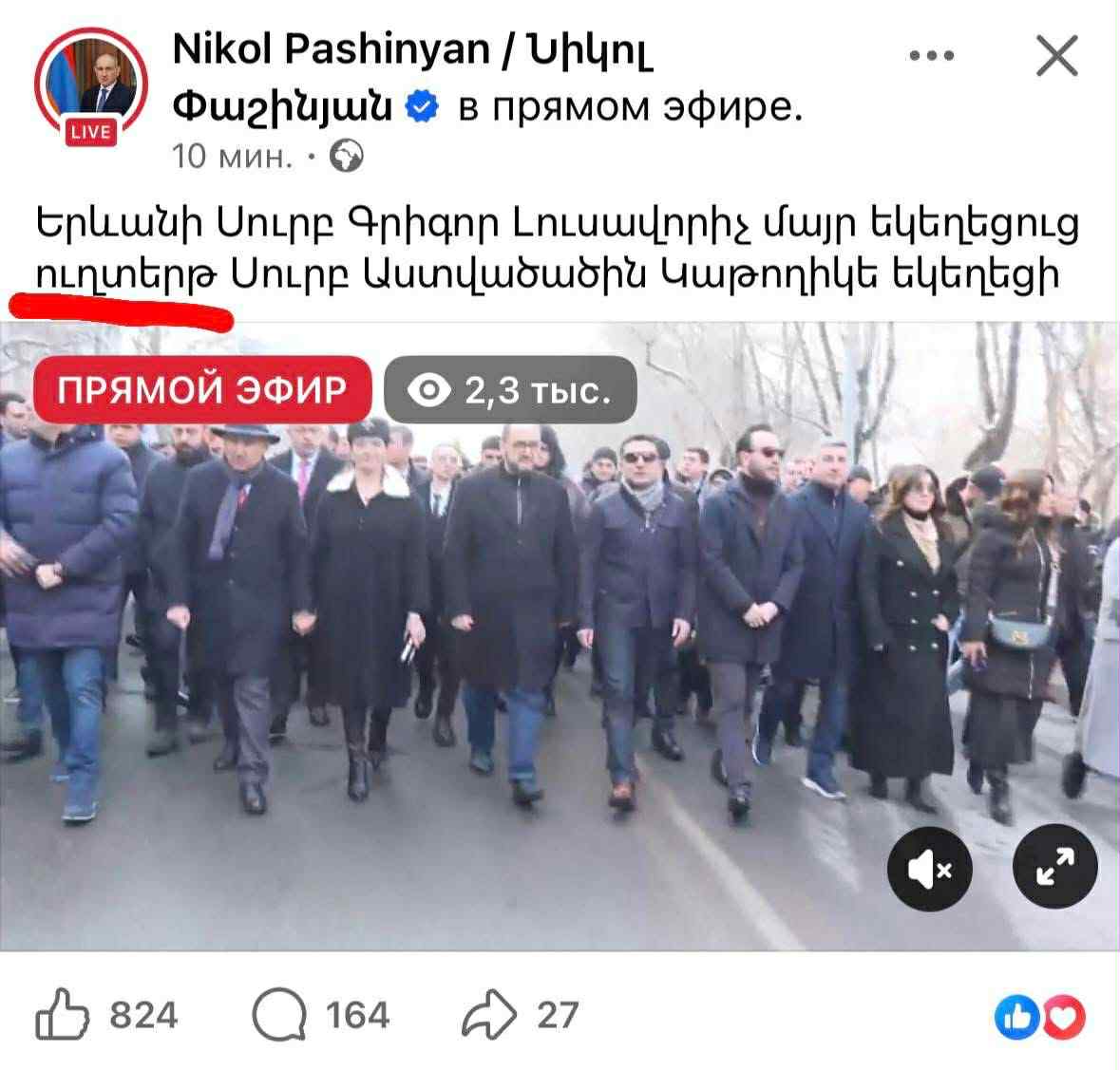 Մեկնարկած ուխտերթի վերաբերյալ ուղիղ միացման վերնագիրը Փաշինյանի ֆեյսբուքյան էջում ներկայացվել է որպես ուղտերթ: Միայն մի քանի րոպե անց վերնագիրն ուղղվեց: