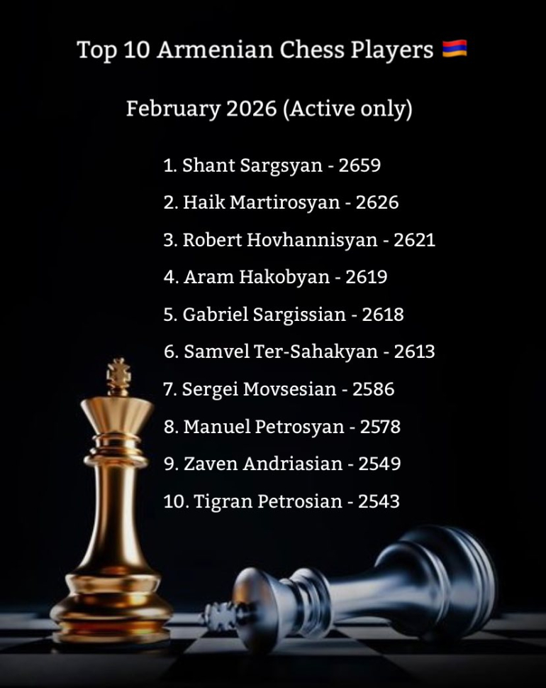 Հայաստանի շախմատի ֆեդերացիան հրապարակել է Հայաստանի 10 լավագույն շախմատիստների և շախմատիստուհիների ցանկը 2026 թվականի փետրվարի 1-ի դրությամբ:
